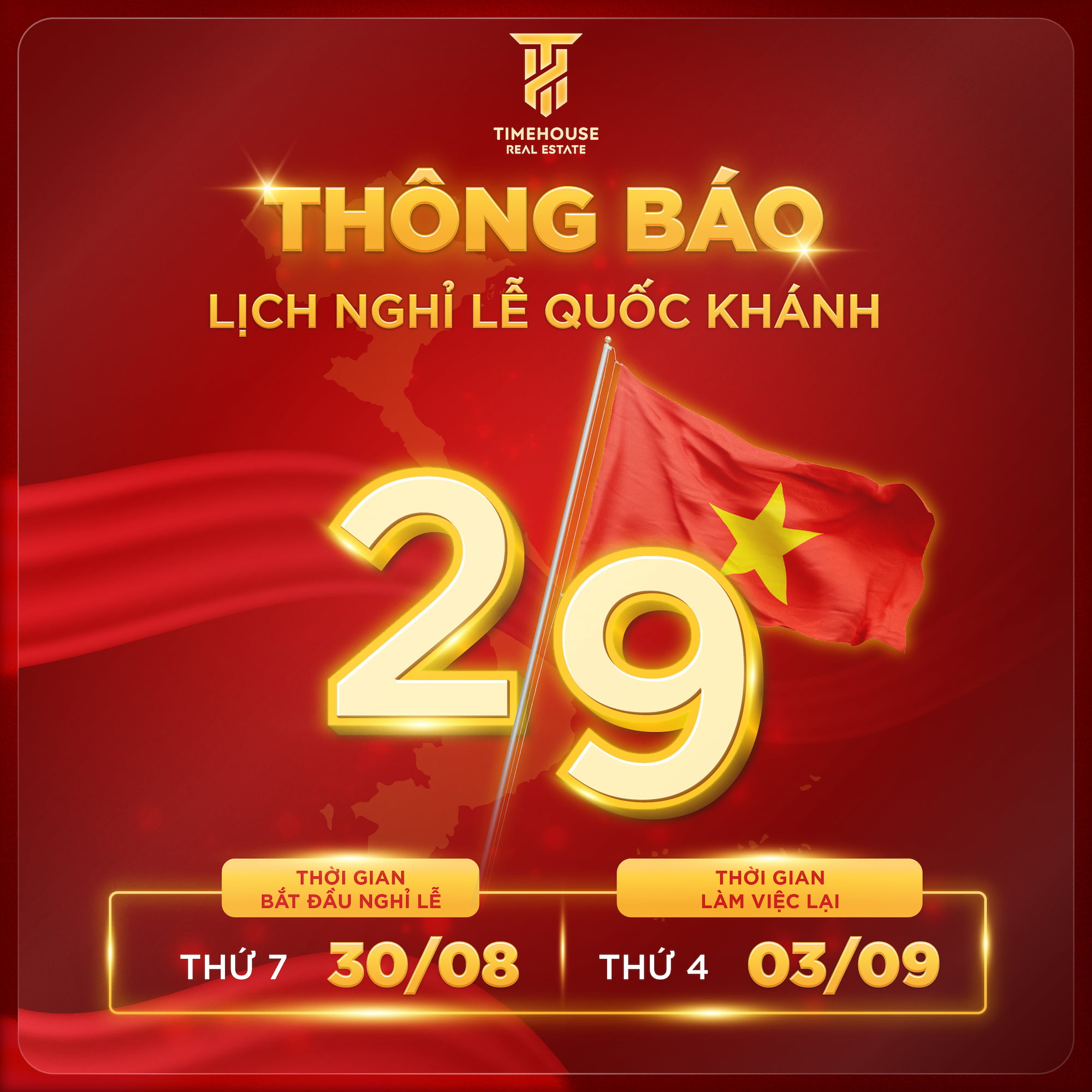 Công ty TimeHouse Real Estate xin thông báo lịch nghỉ lễ Quốc Khánh 02/09/2025 như sau: