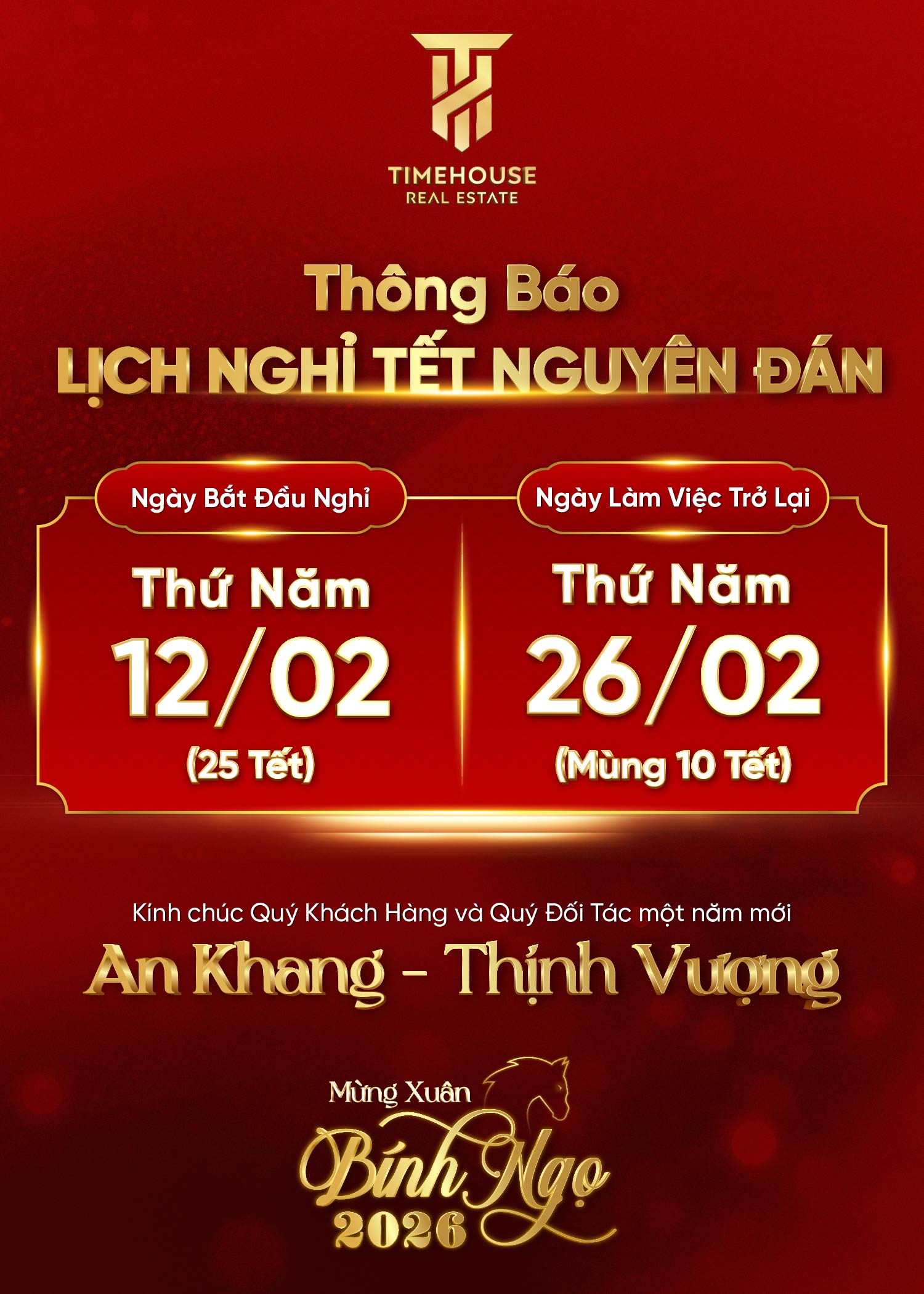 Công ty TimeHouse Real Estate xin thông báo lịch nghỉ Tết Nguyên Đán Bính Ngọ 2026 như sau: